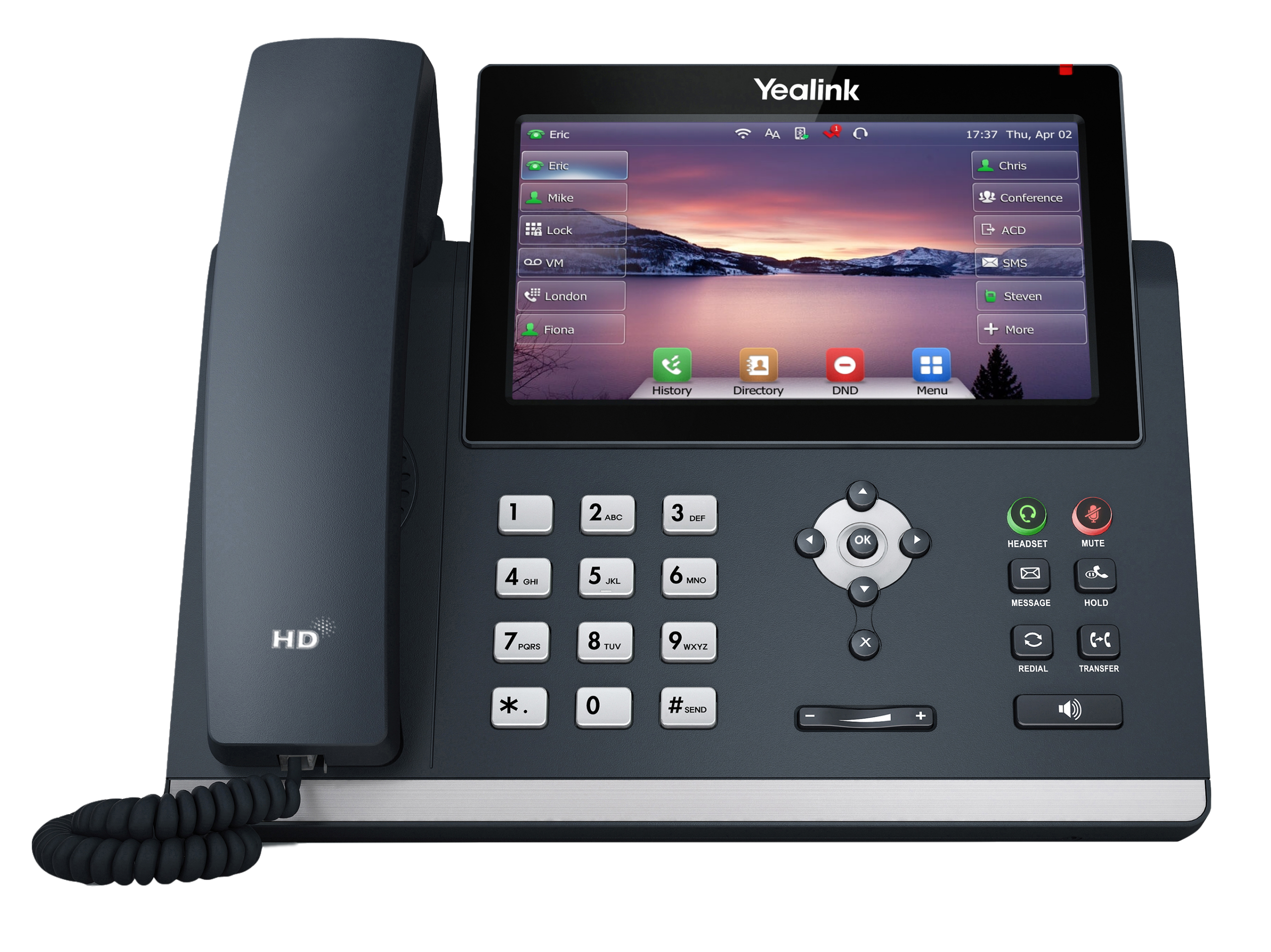 SIP-T48U, T48U VoIP SIP telephone, 2 x Gigabit Ethernet, 29 one-touch DSS keys, PoE required, AC optional, 7 inch touch colour backlit LCD, HD audio, RJ9 headset jack, EHS support (adapter required, SKU #EHS40), 2 x USB, Wi-Fi support (adapter required, SKU #WF40 or SKU #WF50), Bluetooth support (adapter required, SKU #BT41), optional wall mount bracket (SKU #T48 WALL MOUNT), add up to 3 expansion modules (sidecar / attendant console, SKU #EXP43), supports YDMP / YMCS. Optional AC power supply